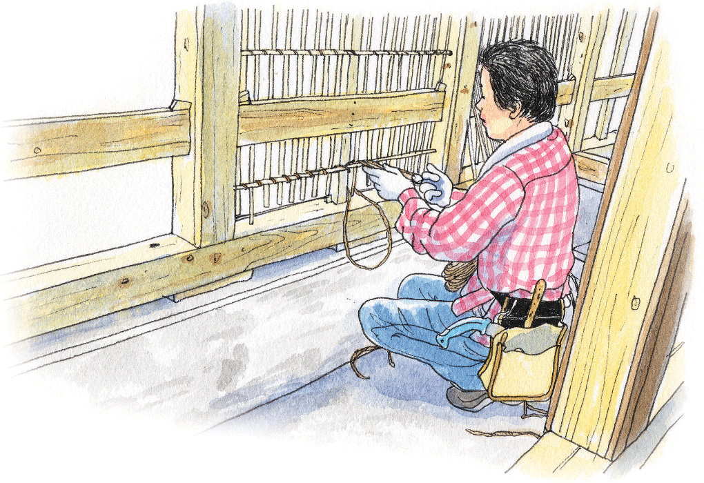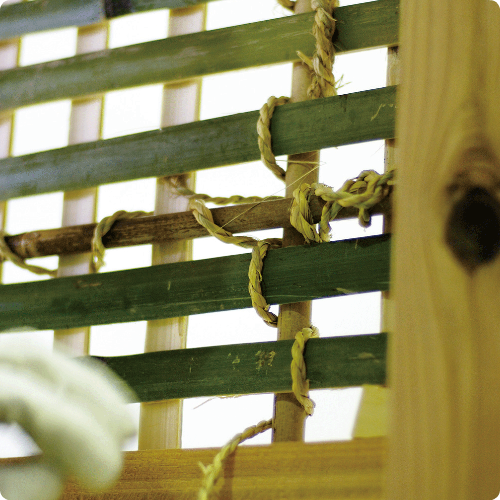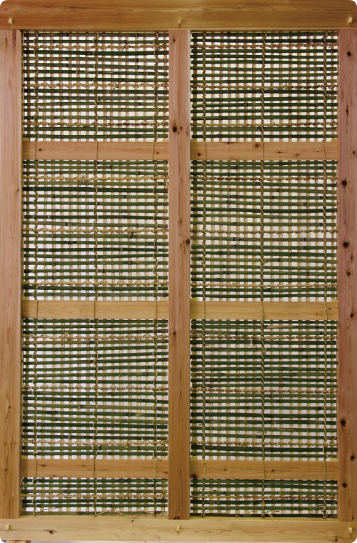 ⑤ヨコ方向に割り竹を入れ間渡し竹に縄で編み付ける