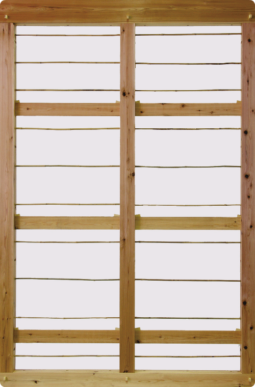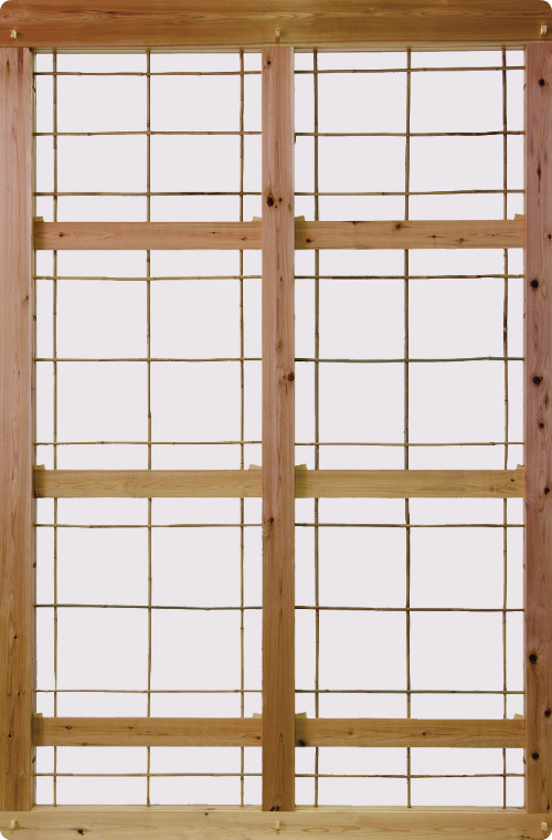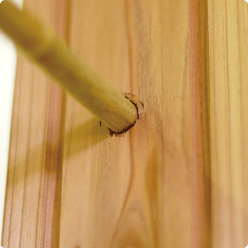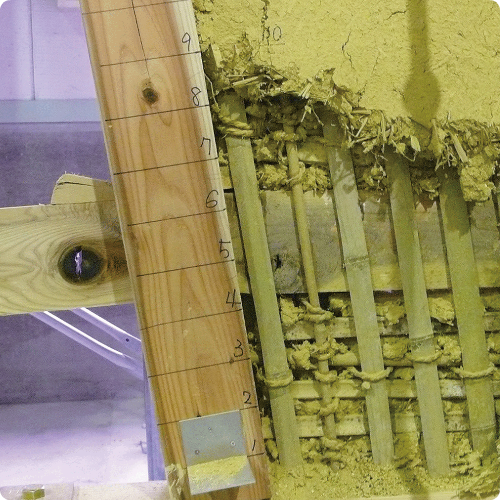 土壁の軸組には、貫穴、間渡し竹を差しこむ穴、散りしゃくりなど、後の工程に対する措置が必要です。これらが正しく施工されていないとよい土壁はつくれません。