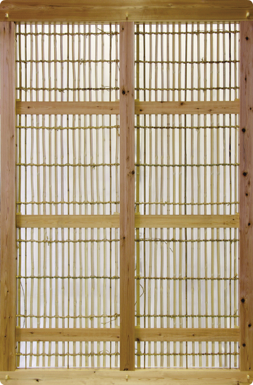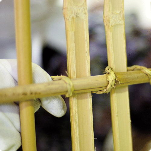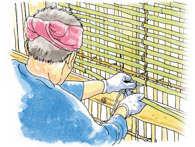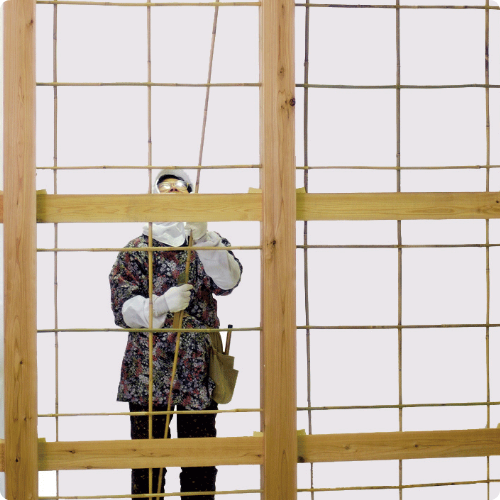 ④タテ方向に割竹を入れ間渡し竹に縄で編み付ける
