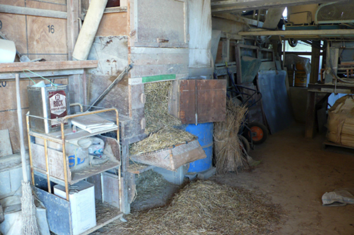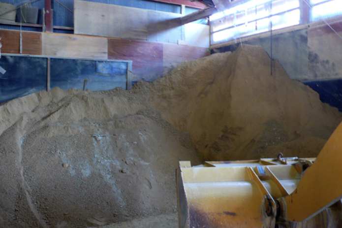 【写真 -7】プールの壁土を専用運搬車に移し、水と蓑で計量した切りワラを加えて攪拌し、目視で状態を確認してから出荷する。ワラは天日干しの稲ワラを地元農家から購入している。