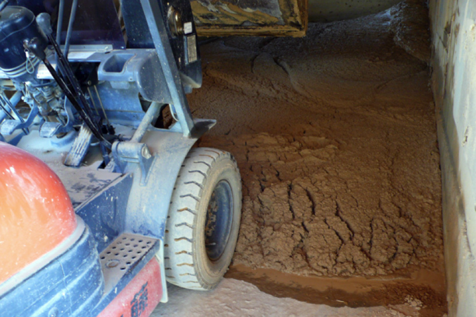 【写真 -5】運ばれた粘土に水と少量のワラを加えて回転攪拌し直下の傾斜付プールに貯める。