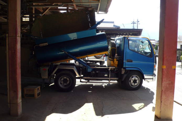 【写真 -9】専用運搬車は 2軸の攪拌スクリュー付タンクを掲載したダンプ車で、積載量は 2立方メートル。通常の 2トン車の約 1.7倍の積載が可能。