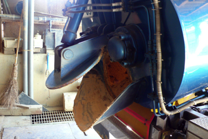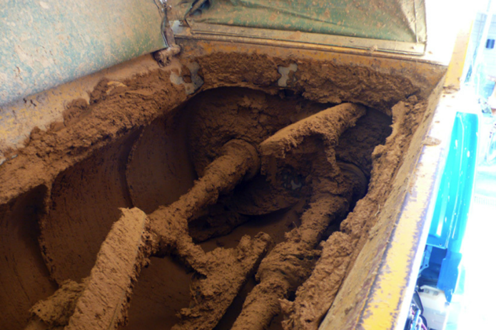 写真−9:壁土運搬車に掲載の2軸の攪拌スクリュー