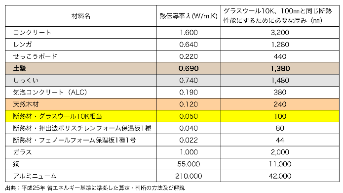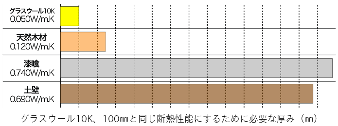 図-2は、100㎜厚のグラスウール10Kと同等の断熱性能を得るために必要な厚みを比較したグラフです。土壁だと1,380㎜が必要になります。