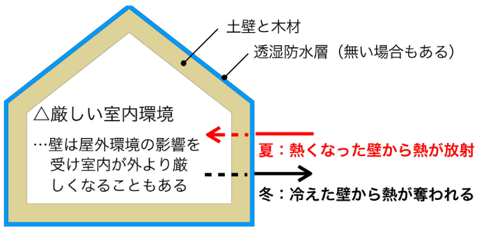 土壁は熱伝導率が大きいので屋外温度の影響を受けやすく、寒暑期の室内環境は厳しいものになりがちです。特に夏の西日や冬の北風が直接あたるような壁に面する部屋では、土壁の蓄熱性も働き室内環境はより厳しくなることがあります。冷暖房の効率が悪く、暑さ寒さを我慢できたとしても健康に影響がないとはいえません。