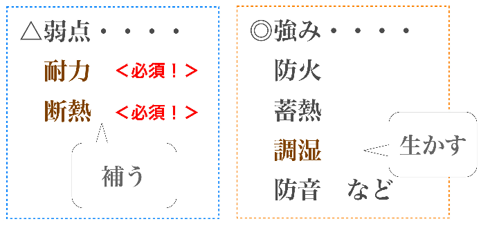 改めて土壁の弱点と強みを見てみます。土壁の弱点は「耐震」と「断熱」、長所としては「防火」、「蓄熱」、「調湿」、「防音」の性能をあげることができます。(図-5)