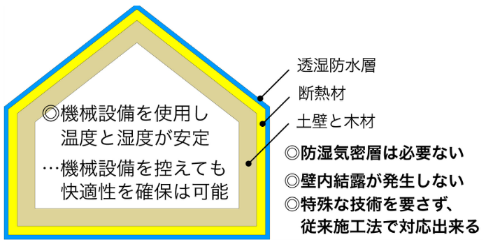 冷暖房の効率を高め室内温度を適切に保ちながら、土壁の調湿性(湿気容量の大きさ)を生かして壁内結露を防止します。評価は結露計算で確認済ですが施工後の現場で経過を観察しています。