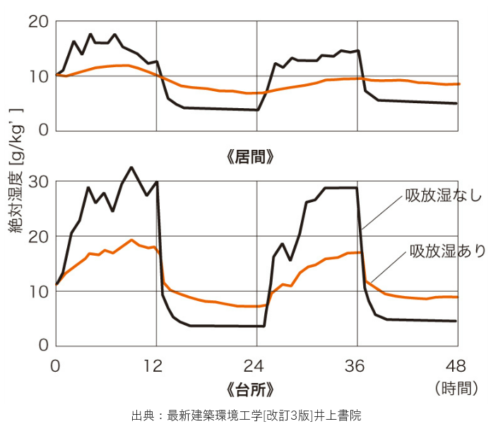 土壁の調湿性は、室内の温熱環境にも好影響を与えます。図-7は、吸放湿性がある土壁とそうでないビニールクロス壁の別に、居間と台所での室内湿度の変化を比較したものです。水蒸気の吸放湿性が大きい土壁の方がより室内湿度が安定していることが分かります。安定した室内湿度は、体感温度などの快適性をより良いものにします。