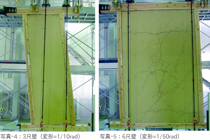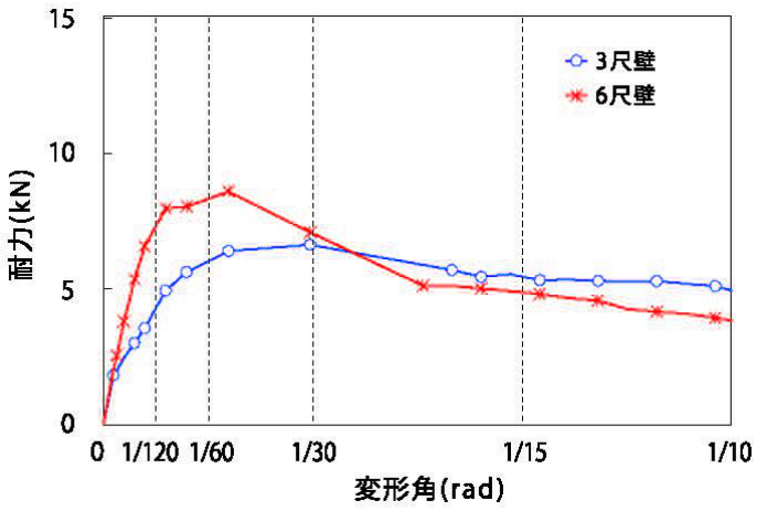 3尺壁の最大耐力は低めですが変形が進んでも耐力の低下が少なく、 6尺壁は 3尺壁に較べると最大耐力は大きく、変形が進むと耐力の低下が早いという傾向が見られます。(図 -1)