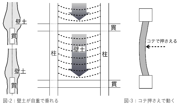 【問題-1】壁土が自重で垂れ、貫の下にすき間が発生、また塗り厚が均一にならず、耐力性能が不安定になり、平滑な仕上げに影響する。(図-2)