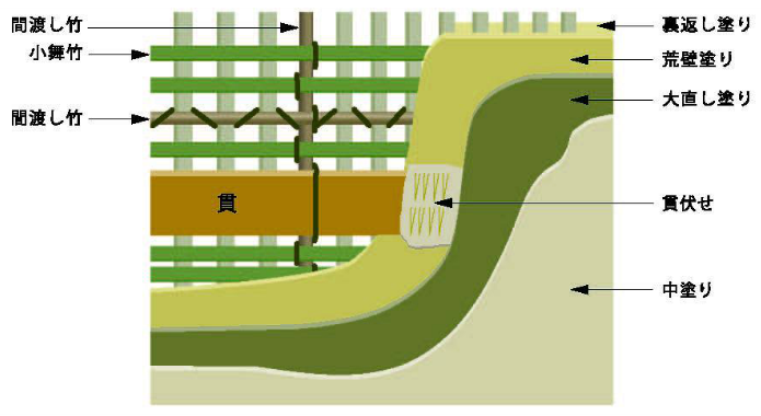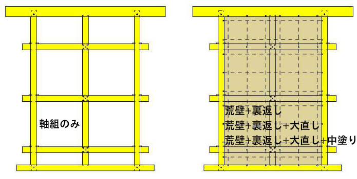 土壁耐力に影響する要素は工程順に、軸組と貫、間渡や木舞の下地、荒壁、裏返し塗り、貫伏せ塗り、大直し塗り、中塗り、で構成されています。(図
