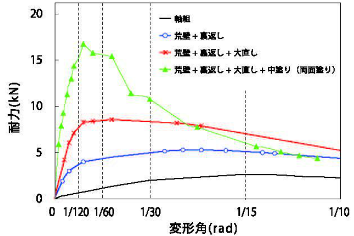 図-3は、壁土を塗り重ねる工程別に実大試験を行った、それぞれの荷重変形角の関係を示すものです。「軸組だけ」、「荒壁+裏返し」、「荒壁+裏返し+大直し」、「荒壁+裏返し+大直し+中塗り」へと塗り工程が増すほどに最大耐力が向上することが確認できます。