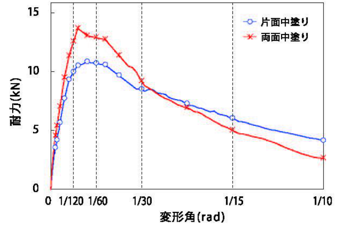 図-4は、中塗りの工程「片面塗り」と「両面塗り」それぞれの場合の荷重と変形の関係を比較したものです。中塗りの両面塗りの効果を確認することができます。
