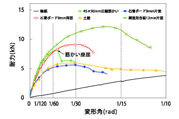 図−5:主要な耐力壁 荷重変形角の関係(土壁は香川県の壁土の場合)