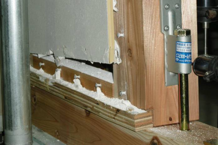 石膏ボードや構造用合板など面材の多くは最大耐力は大きく、破壊は釘部分で起こります。(写真 -5)