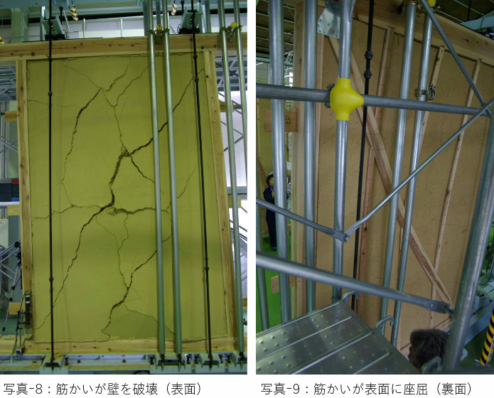 例えば土壁と筋かいを併用する場合、初期剛性に有利な筋かい、変形に有利な土壁、それぞれの特徴が生きる場合もありますが、筋かいの座屈で土壁が破壊されることもあります。(写真 -8、 9)