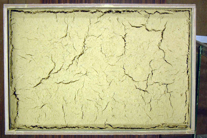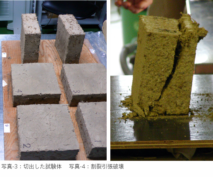 試験は技術解説書に従い実施しました。型枠用合板で作成した 400× 600×深さ 70㎜のバットに壁土を充填し乾燥、バットで乾燥した壁土から 150× 150㎜の試験体を 6体切り出し、万能の圧縮試験機で試験を行うという流れです。