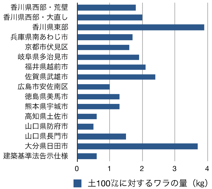 表-4は、小社が調査を行った全国の荒壁土の「わらすさ」配合量です。香川県での荒壁土の「わらすさ」配合割合は告示の3倍以上です。また、この調査では荒木田土の圧縮強度試験を行うため、香川県の左官技能士が「荒木田土」を用いて荒壁土を試作しました。荒木田土100㍑あたりの「わらすさ」は0.9㎏で、例示仕様に示された数値を超えていました。