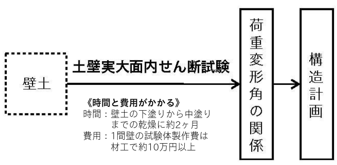 壁土強度試験から実大壁の荷重変形角の関係を求めることができれば、時間と費用がかかる実大試験を行うことなく土壁耐力の構造計算が可能になります。また、壁土の配合が適正かどうかの確認も容易になることで、未経験の材料でつくる使用実績のない壁土でも配合の検討が進めやすくなります。(図 -2)
