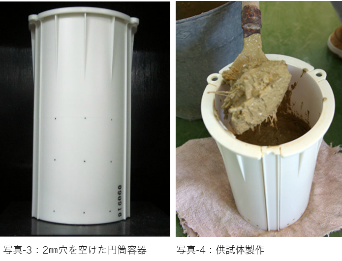 これら問題を解決する新しい試験法を開発しました。コンクリート強度試験と同じ、円筒型供試体(写真 -2)を使った一軸圧縮強度試験です。