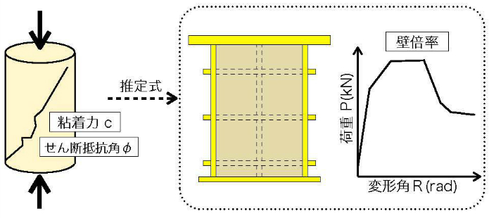 現在、共同研究チームでは、個別に実大面内せん断試験を行わなくても実大壁の構造計算ができるよう、「壁土一軸圧縮強度試験」から「壁土強度定数」を求め、「実大壁の荷重変形角の関係」を導く推定式(図 -3)の開発を進めています。併せて、性能が安定し強度特性に優れた壁土の配合法も検討しています。